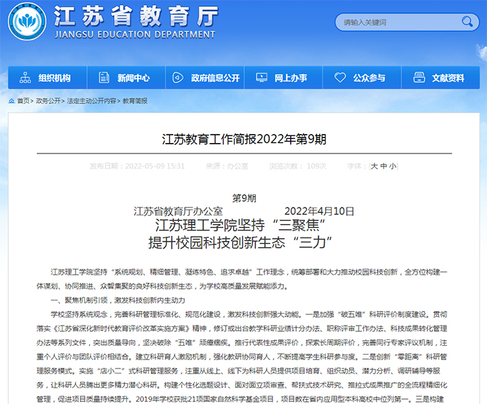 省教育廳辦公室編發的2022年第9期《江蘇教育工作簡報》,以《金年会堅持“三聚焦” 提升校園科技創新生态“三力”》為題,聚焦我校堅持“系統規劃、精細管理、凝練特色、追求卓越”工作理念,統籌部署和大力推動校園科技創新,全方位構建一體謀劃、協同推進、衆智集聚的良好科技創新生态,為學校高質量發展賦能添力。(文/科技處 王碗;審核/梁國斌;編輯/吳婷)